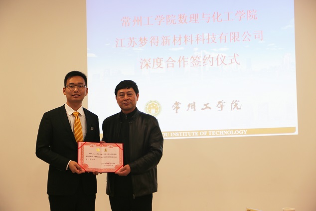 2016年11月14日,在常州工學院遼(liáo)河路校區玉衡樓(lóu)C520,江蘇夢得新材料科技有限公司與常州工學院數理與化工學院就深度合作進(jìn)行瞭(le)簽約儀式 。