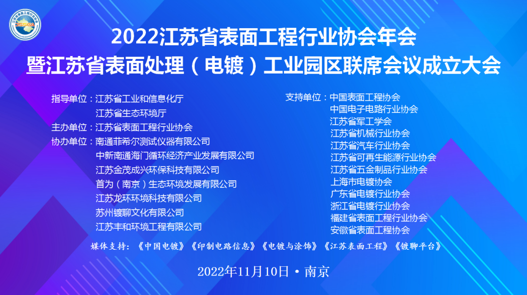 2022年11月10日由江蘇省表面工程行業協會主辦(bàn)的“2022年江蘇省表面工程行業協會年會暨江蘇省表面處理(電鍍)工業園區聯席會議(以下簡稱:聯席會)成立大會”在江蘇省會議中心舉辦(bàn),江蘇夢得新材料科技有限公司董事長杭冬良先生、總經理杭康先生受邀參加瞭(le)此次會議。