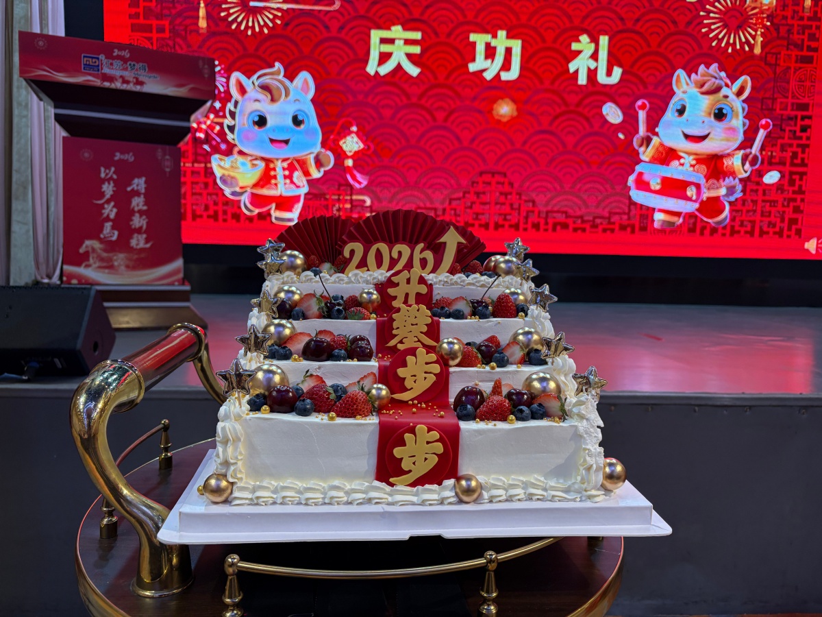 董事長杭冬良先生、總經理杭康先生、公司副總經理貢建華女士共同走上舞台,手持特制的刀具,在全場同仁整齊劃一的倒計時聲中,一同切開瞭(le)這象征著(zhe)團圓、喜悅與希望的慶典蛋糕。“3!2!1!” 當刀刃落下的瞬間,現場掌聲雷動、歡呼聲此起彼伏,閃光燈記錄下這一溫馨而神聖的時刻。這蛋糕,甜在舌尖,暖在心底,不僅是對過往堅守與付出的犒賞,更是責任與傳承的象征,是夢得人同心同德、共赴未來的美好見證。願江蘇夢得如這蛋糕般層層遞進、蒸蒸日上,2026 年續寫更多輝煌篇章;願每一位夢得人都能共享公司發展成果。