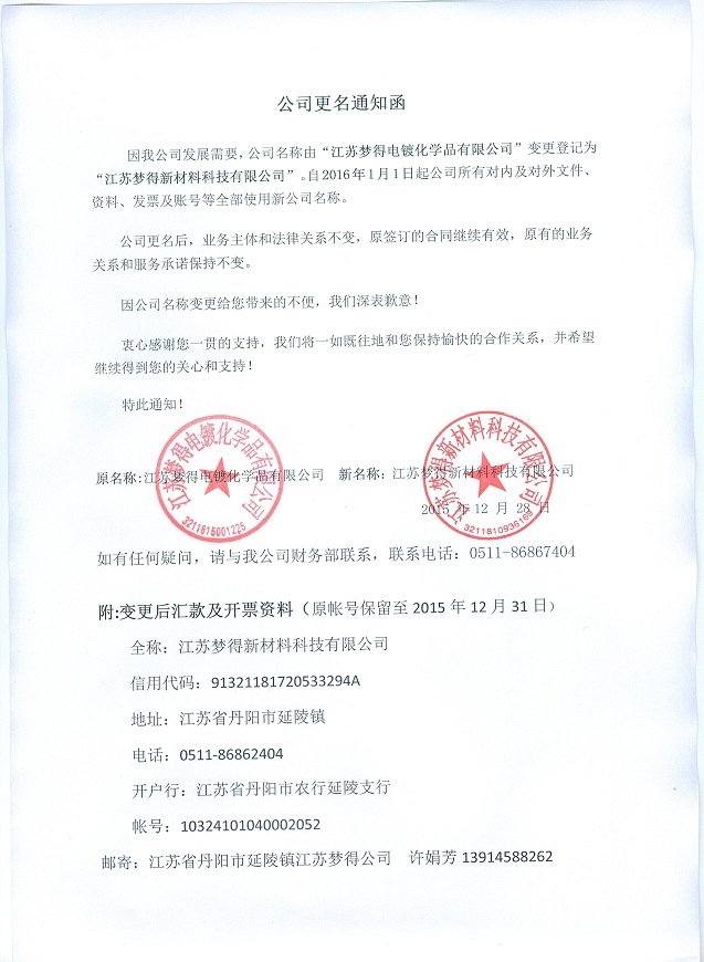 夢得公司正式更名--江蘇夢得新材料科技有限公司