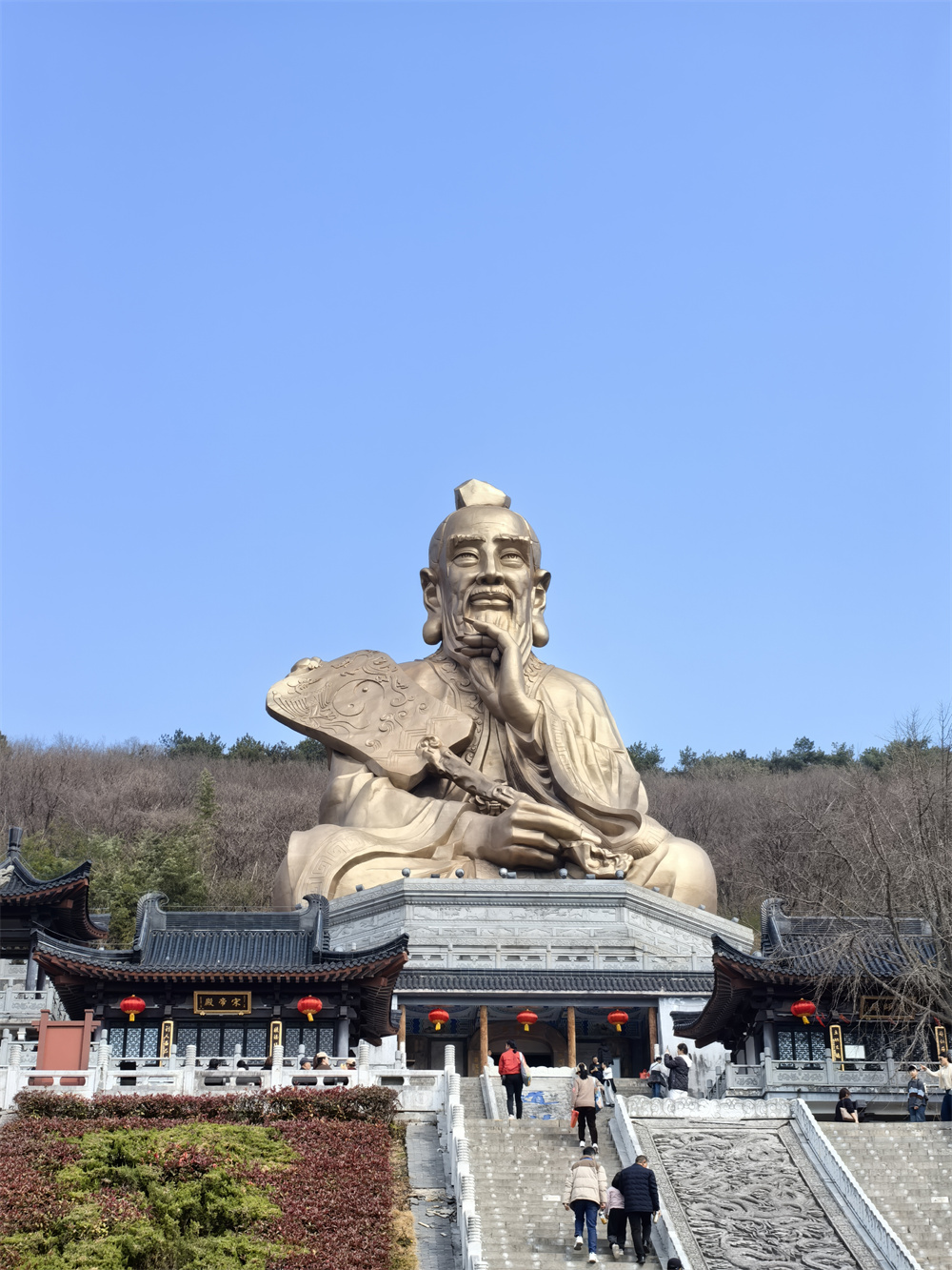 随後,大家乘車下山,來到老子銅像景點。30多米高的老子銅像,莊嚴肅穆,威嚴而祥和。導遊小姐的講解,如同一把鑰匙,打開瞭(le)大家對老子智慧的探索之門。當得知老子銅像手心中數年來聚集瞭(le)兩米多長、一米多寬的蜂巢時,大家紛紛舉起手機,調節放大倍數,拍攝這神奇的畫面。蜂巢沉積的真實畫面,讓衆人驚歎不已。這不僅是自然界生物的偉大,更是人類地理建築的吉祥象征,寓意著(zhe)人們蜂擁而至參拜老子,傳承著(zhe)古老智慧與文化。